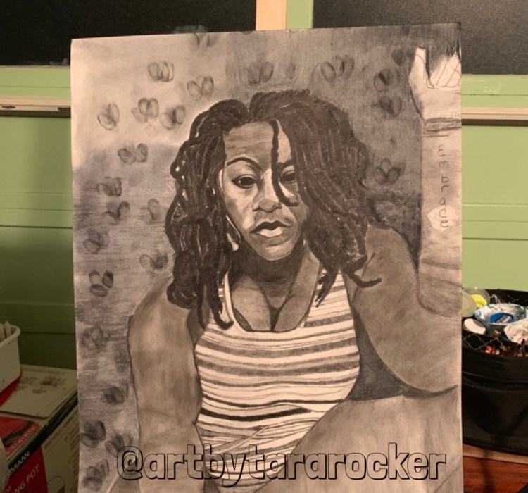 This “selfie-portrait”- (picture of a picture I took of myself). This portrait is piece number 7 in my “Exposed” series. Exposed is all 18X24 sheets of mixed media paper. I have used several mediums including; ink, gouache, watercolor, acrylic, pastel, charcoal, and in “Introspection” (featured), I used graphite, sketch pencils and tinted charcoal.